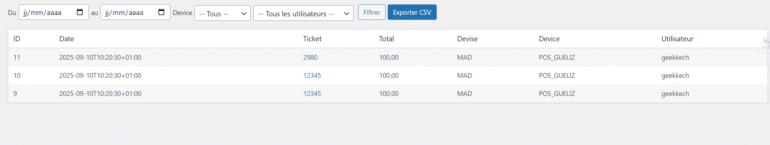 • Enregistrement automatique de chaque ticket avec détails complets (produits, totaux, paiements).