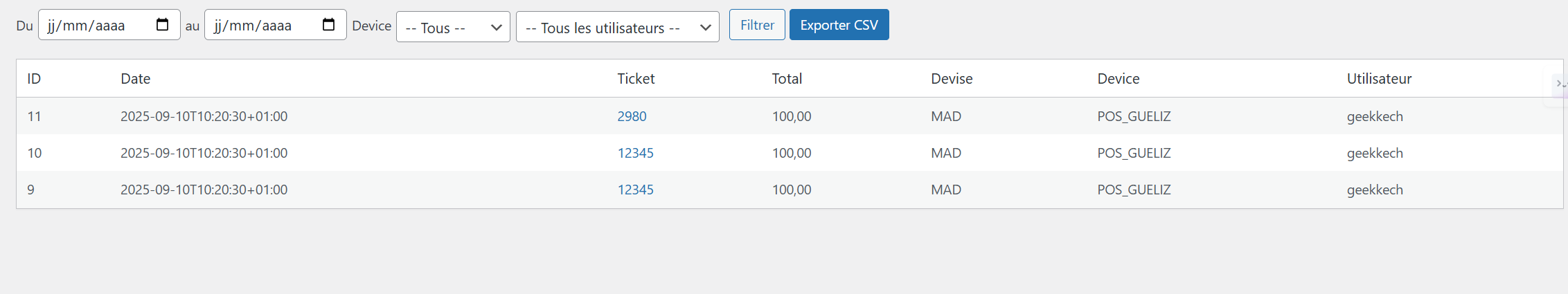 • Enregistrement automatique de chaque ticket avec détails complets (produits, totaux, paiements).